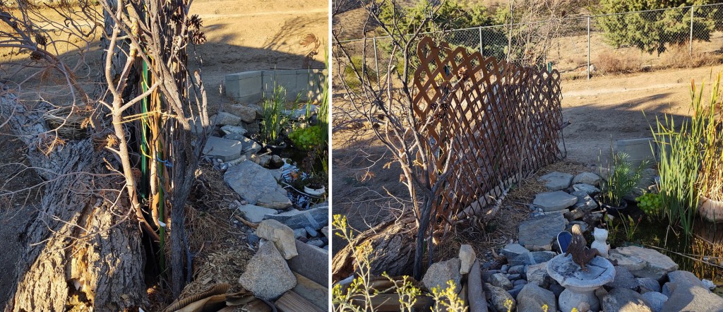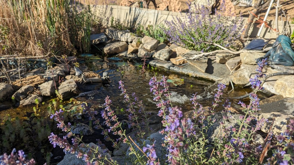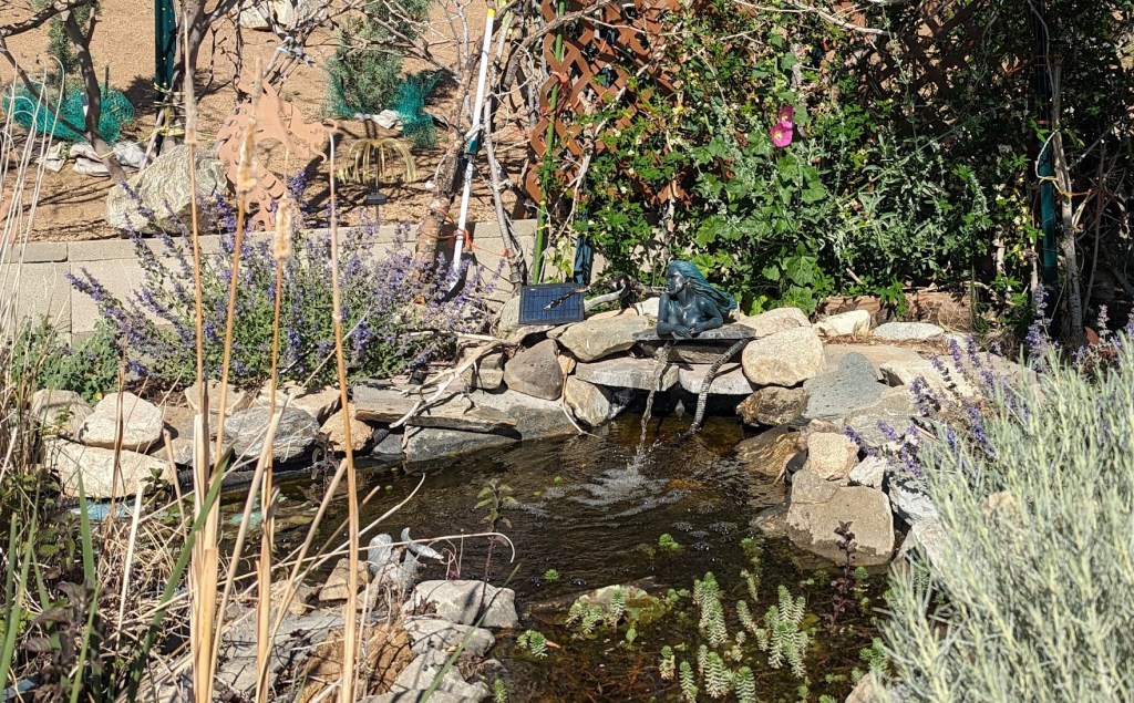 Below is a photo taken after a couple seasons, with a nice assortment of plants added. The pond is a life source for all kinds of beneficial insects, birds, and wildlife that travels through… Coyotes, cats, birds, squirrels and more visit the pond.