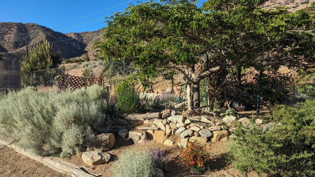 We had a large empty flat space, which originally held an old chicken coop and a flat yard area next to it. I wanted to build a larger wildlife pond, further away from the house. (This pond actually helped us a great deal after the Bobcat Fire, giving me water to take care of a number of baby trees.) The area chosen was at the base of a hillside, perfect for a large pond as well as becoming a future downhill catchall for water… The entire space, save for a lovely young Mimosa Tree, was wide open with nothing growing around it.